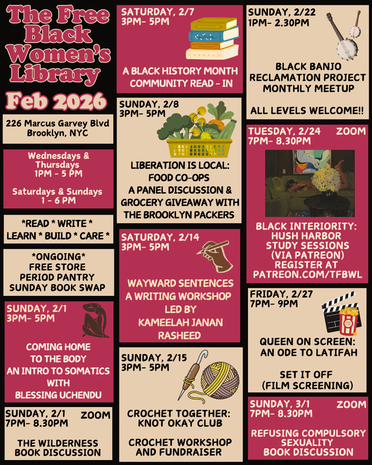 The Free Black Women’s Library is a literary hub, social site, reading room, creative archive, and community care space. All ages, races, and genders are welcome to read, write, co-work, and rest in this space. This social art project features a collection of over 5000 books, a wide array of workshops and free public programs, a Free Store, a Period Pantry, a virtual Reading Club, a backyard garden, and a weekly book swap. We are located at 226 Marcus Garvey Blvd, Brooklyn, NYC, and are currently open on Wednesdays & Thursdays from 1 to 5 pm and Saturdays & Sundays from 1 to 6 pm.